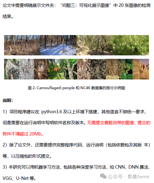 - 目标:使用 CAMO 数据集,设计不少于 3 种图像处理特征或直接训练一个检测模型,实现伪装物体的识别与定位;评价指标包含IoU 与 MAE。并展示"问题一:可视化展示图像"中 10 张图的可视化结果。