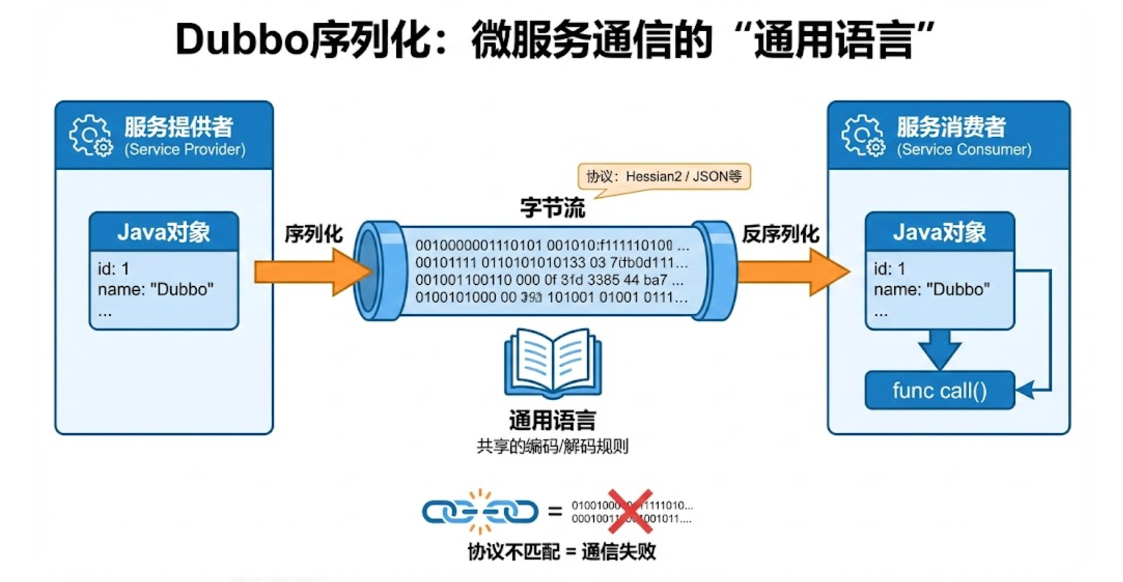 在单体应用中,方法调用是直接而高效的。但在以Dubbo为核心的微服务架构中,一次简单的本地方法调用转变为一次跨越网络的远程过程调用(RPC),对象必须被转换为字节流,穿越网络,再在另一端被重新组装。这个编码与解码的过程,就是序列化与反序列化。