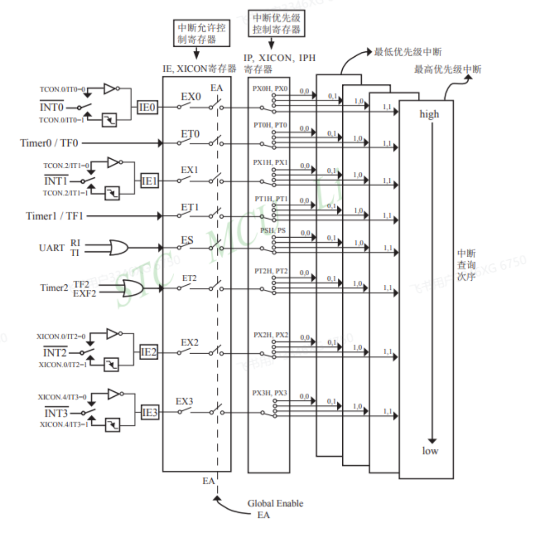 下面这个框图很重要,它会给我们介绍,如果我们需要使用单片机的某个中断,需要配置哪些寄存器,我们通过框图、再结合寄存器表格和示例程序,就能知道怎么使用单片机中断。