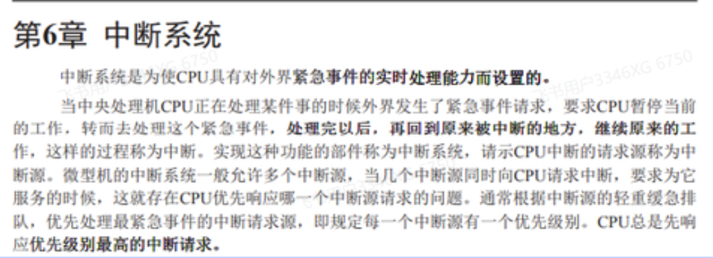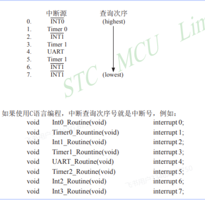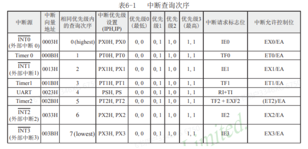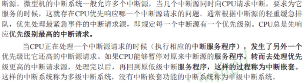 每一个中断的优先级别均可用软件设置。高优先级的中断请求可以打断低优先级的中断,反之,低优先级的中断请求不可以打断高优先级及同优先级的中断。当两个相同优先级的中断同时产生时,将由查询次序来决定系统先响应哪个中断