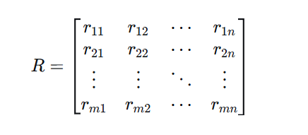 其中 ruirui 表示用户 uu 对物品 ii 的评分,未评分的元素通常用0或缺失值表示。在实际应用中,这个矩阵通常非常稀疏,只有少量元素有观测值。