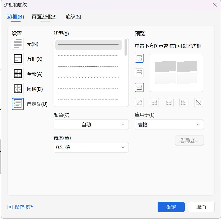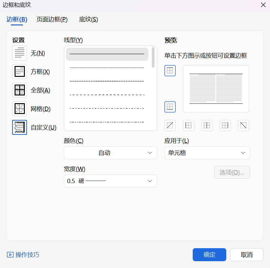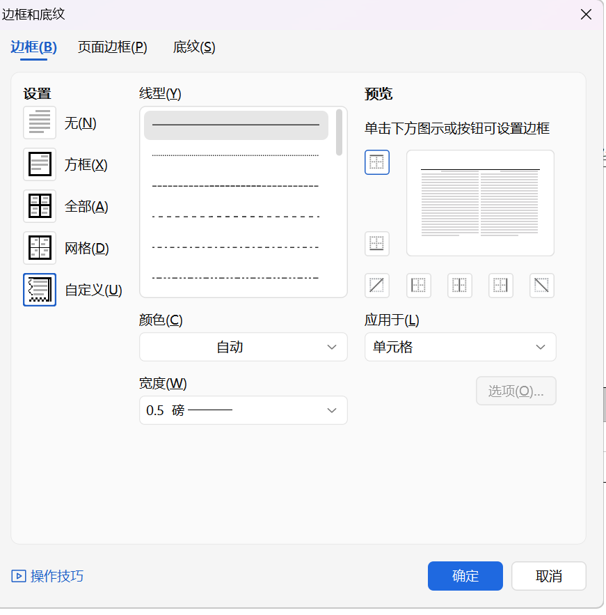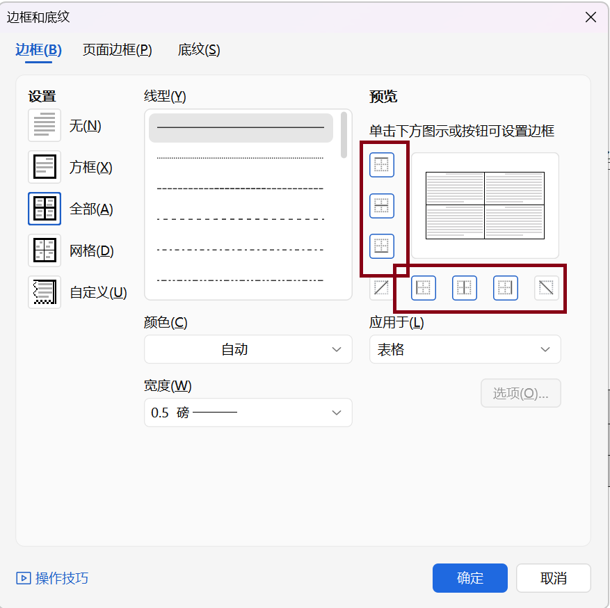 3 修改边框设置为只有最上和最下"横"的边框,关闭所有竖。