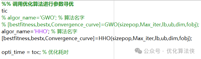 公众号也发布了很多算法,它们大多都是以函数的形式编写,调用仅需一行代码。替换GWO即可,非常方便,代码工作量也仅一行 。比如使用哈里斯鹰优化算法HHO,下载HHO的代码,放在和GWO同一个文件下,然后在主程序相应位置里按HHO的输入、输出形式调用即可,即插即用。如果你想使用的算法不是函数的形式,请把它修改成函数形式,方便调用。