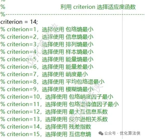 包络熵最小,Envelope entropy(水烂了)信息熵最小,Information entropy(水烂了)排列熵最小,Permutation entropy(水烂了)样本熵最小,Sample entropy(水烂了)能量熵最小,energy entropy能量差最小,energy error峭度最小,kurtosis平均包络熵最小,Average Envelope entropy模糊熵最小,Fuzzy entropy包络峭度因子最小,Envelope kurtosis包络谱峰值因子最小,crest factor of envelope spectrum最大互信息系数皮尔逊相关系数残差指数最小,residual error index (REI)互信息熵最小,Mutual Information