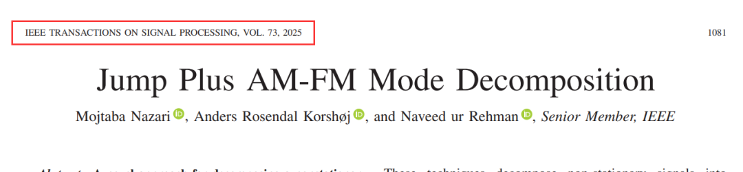 本期推出2025年一款小众、最新、性能强大信号分解方法,Jump Plus AM-FM Mode Decomposition,JMD ,发表在信号领域顶级期刊 IEEE Transactions on signal processing(简称IEEE TSP),全新方法,知道的人很少,这口饭赶紧趁快吃呀。