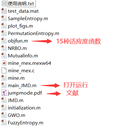 参照其他模态分解方法的参数优化方式,JMD参数优化的创新方式可以有两种:1,改进优化算法用于优化;2,提出新的适应度函数 。第一种很常见,第二种却不多。本期整理并复现了一些高水平EI、SCI期刊中的适应度函数,加上一些常规的适应度函数,目前一共15 种用以参数优化的适应度函数**。**