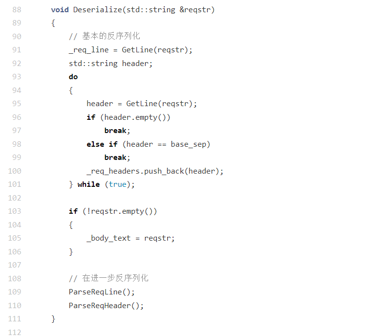 do-while循环持续调用GetLine提取内容,将非空、非分隔符的行存入_req_headers(原始请求头列表);当遇到空行或base_sep(\r\n)时终止循环(对应 HTTP 协议中 "请求头与请求体的分隔规则");- 提取请求体 :若