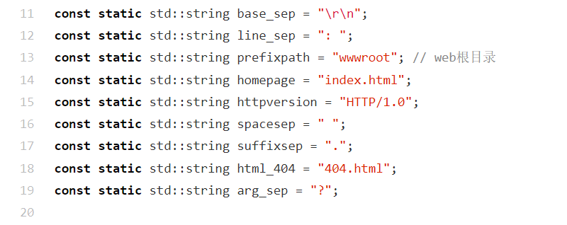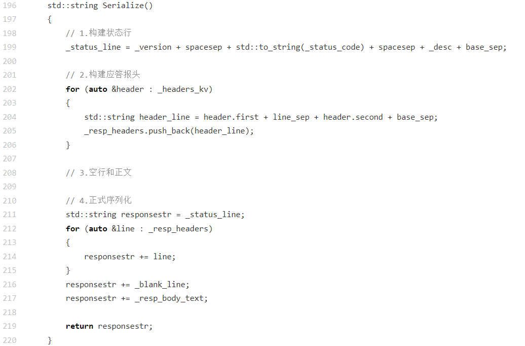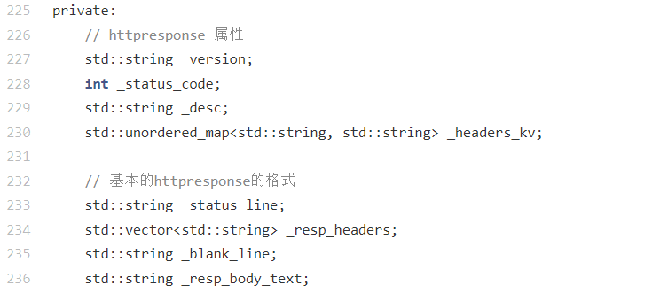 std::string _status_line;:存储组装完成的响应状态行(如HTTP/1.0 200 OK\r\n),是响应的首行内容。std::vector<std::string> _resp_headers;:存储格式化后的响应头列表(每条为完整的头信息行),用于后续拼接响应字符串。std::string _blank_line;:存储响应头与响应体之间的空行分隔符(\r\n),符合 HTTP 协议的格式规范。std::string _resp_body_text;:存储响应的正文内容(如 HTML 页面、数据),是客户端接收的实际内容。这是