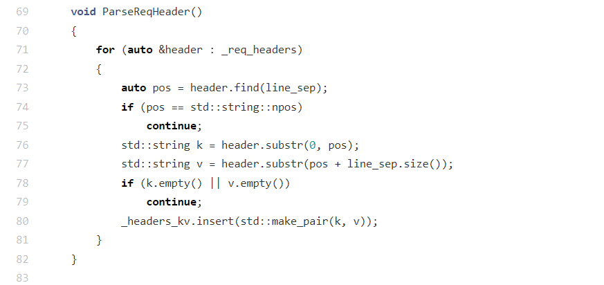 该函数实现了 "原始请求字符串→基础结构→结构化字段" 的分层解析逻辑,将无结构的 HTTP 请求数据,转化为程序可直接使用的结构化信息(如请求方法、资源路径、请求头键值对),为后续服务器的资源定位、响应构建等流程提供了可直接调用的数据基础。