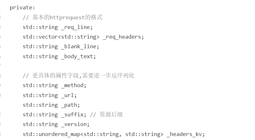 std::string _req_line;:存储 HTTP 请求的请求行 (比如GET /index.html HTTP/1.0)。std::vector<std::string> _req_headers;:存储未解析的原始请求头列表(每行是一条完整的头信息)。std::string _blank_line;:存储请求头与请求体之间的空行 (对应 HTTP 协议的\r\n分隔)。std::string _body_text;:存储 HTTP 请求的请求体内容(比如 POST 提交的参数、GET 的查询参数)。第二部分:解析后的具体属性字段