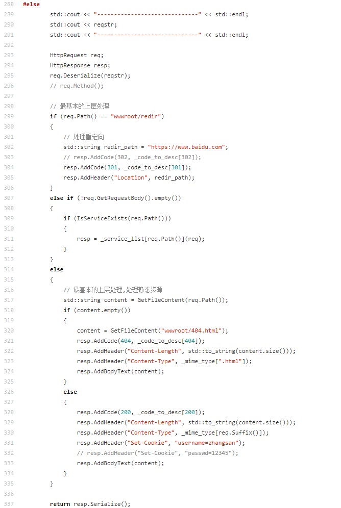 cpp#pragma once #include <iostream> #include <string> #include <vector> #include <sstream> #include <functional> #include <fstream> #include <unordered_map> const static std::string base_sep = "\r\n"; const static std::string line_sep = ": "; const static std::string prefixpath = "wwwroot"; // web根目录 const static std::string homepage = "index.html"; const static std::string httpversion = "HTTP/1.0"; const static std::string spacesep = " "; const static std::string suffixsep = "."; const static std::string html_404 = "404.html"; const static std::string arg_sep = "?"; class HttpRequest { private: //\r\n //\r\ndata std::string GetLine(std::string &reqstr) { auto pos = reqstr.find(base_sep); if (pos == std::string::npos) return std::string(); std::string line = reqstr.substr(0, pos); reqstr.erase(0, line.size() + base_sep.size()); return line.empty() ? base_sep : line; } void ParseReqLine() { std::stringstream ss(_req_line); // cin>> ss >> _method >> _url >> _version; if (strcasecmp(_method.c_str(), "GET") == 0) { auto pos = _url.find(arg_sep); if (pos != std::string::npos) { _body_text = _url.substr(pos + arg_sep.size()); _url.resize(pos); } } _path += _url; if (_path[_path.size() - 1] == '/') { _path += homepage; // 如果用户没有指定资源路径名,那么我们就自动将首页信息返回 } // wwwroot/index.html // wwwroot/image/1.png auto pos = _path.rfind(suffixsep); if (pos != std::string::npos) { _suffix = _path.substr(pos); } else { _suffix = " .default"; } } void ParseReqHeader() { for (auto &header : _req_headers) { auto pos = header.find(line_sep); if (pos == std::string::npos) continue; std::string k = header.substr(0, pos); std::string v = header.substr(pos + line_sep.size()); if (k.empty() || v.empty()) continue; _headers_kv.insert(std::make_pair(k, v)); } } public: HttpRequest() : _blank_line(base_sep), _path(prefixpath) { } void Deserialize(std::string &reqstr) { // 基本的反序列化 _req_line = GetLine(reqstr); std::string header; do { header = GetLine(reqstr); if (header.empty()) break; else if (header == base_sep) break; _req_headers.push_back(header); } while (true); if (!reqstr.empty()) { _body_text = reqstr; } // 在进一步反序列化 ParseReqLine(); ParseReqHeader(); } std::string Url() { LOG(DEBUG, "Client Want url %s\n", _url.c_str()); return _url; } std::string Path() { LOG(DEBUG, "Client Want path %s\n", _path.c_str()); return _path; } std::string Suffix() { return _suffix; } std::string Method() { LOG(DEBUG, "Client request method is %s\n", _method.c_str()); return _method; } std::string GetRequestBody() { LOG(DEBUG, "Client request method is %s, args: %s, request path: %s\n", _method.c_str(), _body_text.c_str(), _path.c_str()); return _body_text; } void Print() { std::cout << "------------------" << std::endl; std::cout << "###" << _req_line << std::endl; for (auto &header : _req_headers) { std::cout << "@@@" << header << std::endl; } std::cout << "***" << _blank_line; std::cout << ">>>" << _body_text << std::endl; std::cout << "Method: " << _method << std::endl; std::cout << "Url: " << _url << std::endl; std::cout << "Version: " << _version << std::endl; for (auto &headers_kv : _headers_kv) { std::cout << ")))" << headers_kv.first << "->" << headers_kv.second << std::endl; } } ~HttpRequest() { } private: // 基本的httprequest的格式 std::string _req_line; std::vector<std::string> _req_headers; std::string _blank_line; std::string _body_text; // 更具体的属性字段,需要进一步反序列化 std::string _method; std::string _url; std::string _path; std::string _suffix; // 资源后缀 std::string _version; std::unordered_map<std::string, std::string> _headers_kv; }; class HttpResponse { public: HttpResponse() : _version(httpversion), _blank_line(base_sep) { } void AddCode(int code, const std::string &desc) { _status_code = code; _desc = desc; } void AddHeader(const std::string &k, const std::string &v) { _headers_kv[k] = v; } void AddBodyText(const std::string &body_text) { _resp_body_text = body_text; } std::string Serialize() { // 1.构建状态行 _status_line = _version + spacesep + std::to_string(_status_code) + spacesep + _desc + base_sep; // 2.构建应答报头 for (auto &header : _headers_kv) { std::string header_line = header.first + line_sep + header.second + base_sep; _resp_headers.push_back(header_line); } // 3.空行和正文 // 4.正式序列化 std::string responsestr = _status_line; for (auto &line : _resp_headers) { responsestr += line; } responsestr += _blank_line; responsestr += _resp_body_text; return responsestr; } ~HttpResponse() { } private: // httpresponse 属性 std::string _version; int _status_code; std::string _desc; std::unordered_map<std::string, std::string> _headers_kv; // 基本的httpresponse的格式 std::string _status_line; std::vector<std::string> _resp_headers; std::string _blank_line; std::string _resp_body_text; }; using func_t = std::function<HttpResponse(HttpRequest &)>; class HttpServer { private: std::string GetFileContent(const std::string &path) { std::ifstream in(path, std::ios::binary); if (!in.is_open()) return std::string(); in.seekg(0, in.end); int filesize = in.tellg(); // 告知我你的rw偏移量是多少 in.seekg(0, in.beg); std::string content; content.resize(filesize); in.read((char *)content.c_str(), filesize); in.close(); return content; } public: HttpServer() { _mime_type.insert(std::make_pair(".html", "text/html")); _mime_type.insert(std::make_pair(".jpg", "image/jpeg")); _mime_type.insert(std::make_pair(".png", "image/png")); _mime_type.insert(std::make_pair(".default", "text/html")); _code_to_desc.insert(std::make_pair(100, "Continue")); _code_to_desc.insert(std::make_pair(200, "OK")); _code_to_desc.insert(std::make_pair(201, "Created")); _code_to_desc.insert(std::make_pair(301, "Moved Permanently")); _code_to_desc.insert(std::make_pair(302, "Found")); _code_to_desc.insert(std::make_pair(404, "Not Found")); } std::string HandlerHttpRequest(std::string &reqstr) // req