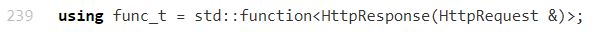 using为std::function定义别名func_t,其函数签名为:接收HttpRequest&(HTTP 请求对象的引用)作为参数,返回HttpResponse(HTTP 响应对象)。实际用途 在 HTTP 服务器开发中,
