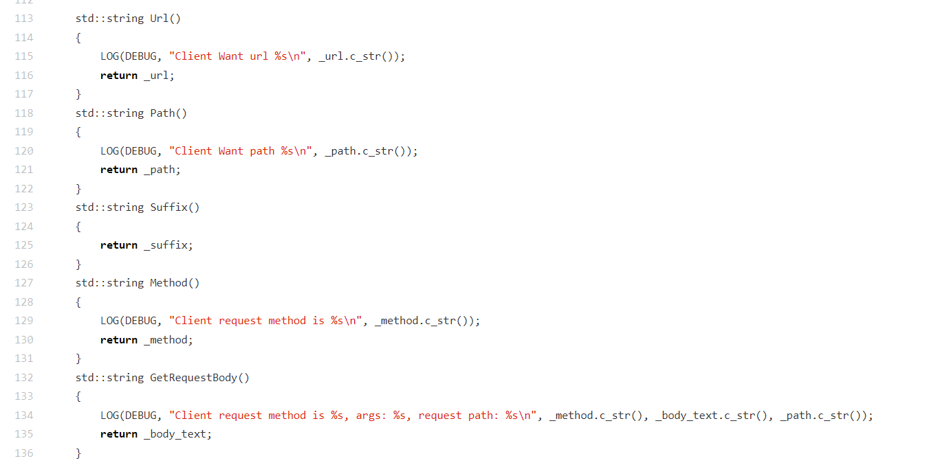 HttpRequest类的数据访问函数,核心作用是对外提供解析后的 HTTP 请求信息(部分含调试日志):