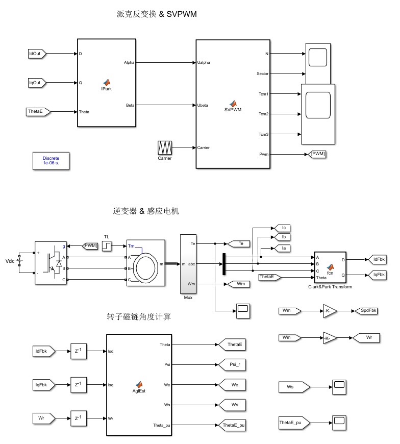 ADRC线性自抗扰控制感应电机矢量控制调速Matlab/Simulink仿真 1.模型简介 模型为基于线性自抗扰控制(LADRC)的感应(异步)电机矢量控制仿真,采用Matlab R2018a/Simulink搭建。 模型内主要包含DC直流电压源、三相逆变器、感应(异步)电机、采样模块、SVPWM、Clark、Park、Ipark、采用一阶线性自抗扰控制器的速度环和电流环等模块,其中,SVPWM、Clark、Park、Ipark、线性自抗扰控制器模块采用Matlab funtion编写,其与C语言编程较为接近,容易进行实物移植。 模型均采用离散化仿真,其效果更接近实际数字控制系统。 2.算法简介 感应电机调速系统由转速环和电流环构成,均采用一阶线性自抗扰控制器。 在电流环中,自抗扰控制器将电压耦合项视为扰动观测并补偿,能够实现电流环解耦;在转速环中,由于自抗扰控制器无积分环节,因此无积分饱和现象,无需抗积分饱和算法,转速阶跃响应无超调。 自抗扰控制器的快速性和抗扰性能较好,其待整定参数少,且物理意义明确,比较容易调整。 3.仿真效果 1 转速响应与转矩电流Iq响应波形 - 转速阶跃响应无超调,如下图1所示。 2 转速响应与三相电流波形,如下图2所示。 3 励磁电流Id与转矩电流Iq响应波形,如下图3所示。 4. 可提供模型内相关算法的参考文献,避免大量阅读文献浪费时间。