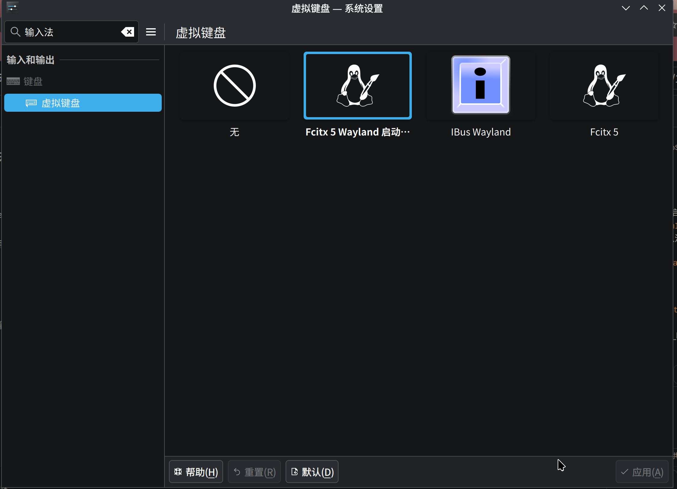 选中 Fcitx 5 Wayland 启动器,或者iBus Wayland