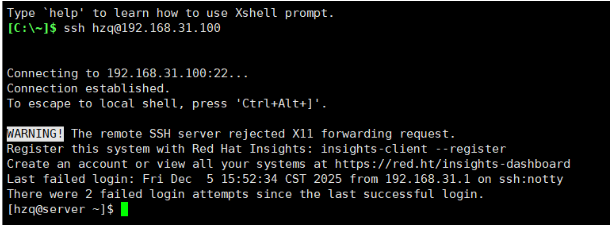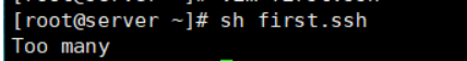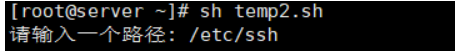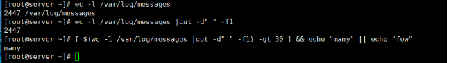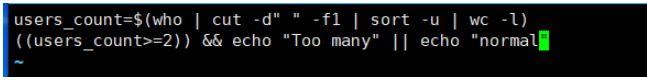 root@server \~\]# test -f /etc/passwd \[root@server \~\]# echo $? 0 \[root@server \~\]# test -f /etc/passwd \&\& echo 真 \|\| echo 假 (将两条命令合在一起) 真 \[root@server \~\]# test -f /etc/ssh \&\& echo 真 \|\| echo 假 (ssh不是文件是一个目录) 假 \[root@server \~\]# test -f /etc/ssh/sshd_config \&\& echo 真 \|\| echo 假 真 \[root@server \~\]# test -d /etc/ssh \&\& echo 真 \|\| echo 假 真 \[root@server \~\]# test -e /etc/ssh \&\& echo 真 \|\| echo 假 真 \[root@server \~\]# test -r /etc/ssh \&\& echo 真 \|\| echo 假 真 \[root@server \~\]# test -w /etc/ssh \&\& echo 真 \|\| echo 假 真 \[root@server \~\]# test -x /etc/ssh \&\& echo 真 \|\| echo 假 真 \[root@server \~\]# test -L /etc/ssh \&\& echo 真 \|\| echo 假 假 \[root@server \~\]# test -s /etc/passwd \&\& echo 真 \|\| echo 假 真 一个文件如果具备x权限表示它可执行,一个目录如果具备x权限表示是否可以进 **二、\[\]的用法** \[root@server \~\]# \[ -f /etc/cron.d \] \&\& echo true \|\| echo false false \[root@server \~\]# \[ -d /etc/cron.d \] \&\& echo true \|\| echo false true \[root@server \~\]# \[ -L /etc/cron.d \] \&\& echo true \|\| echo false false \[root@server \~\]# \[ -S /etc/cron.d \] \&\& echo true \|\| echo false false \[root@server \~\]# mkfifo pip #创建管道文件 \[root@server \~\]# \[ -p pip \] \&\& echo true \|\| echo false true # 逻辑运算 -a与 -o或 !非 \[\[\]\]的用法,\[\[\]\]是\[\]强化版本,所以\[\]支持的方法\[\[\]\]完全支持,并且额外支持: 比较运算符无需转义 支持逻辑运算符 \&\& 、\|\|、! 支持模式匹配(正则表达式) **三、整数测试** **案例分析** **例1:判断当前系统中已登录账户数,若大于等于2个则输出"Too many" 否则输出" normal"** 1.打开虚拟机随便创建一个普通用户并进入,然后进入Xshell  2.首先用w命令查看账户数  3.进行查重,查重命令为  或  4.统计行数  5.写脚本 进入#vim first.ssh  然后执行 sh first.ssh 6、启用脚本后可查看为Too many(如图1),如果我断掉右边的普通用户则为normal(如图2) 图1:  图2:  **3.例2:编写脚本temp2.sh ,程序允许输入一个目录名,** **判断该目录是否存在,若不存在则创建,并显示目录信息** 1.vim temp2.sh  #### **执行**  **例3:如果/var/log/messages文件行数大于30行,则显示"多",否则显示"少"**