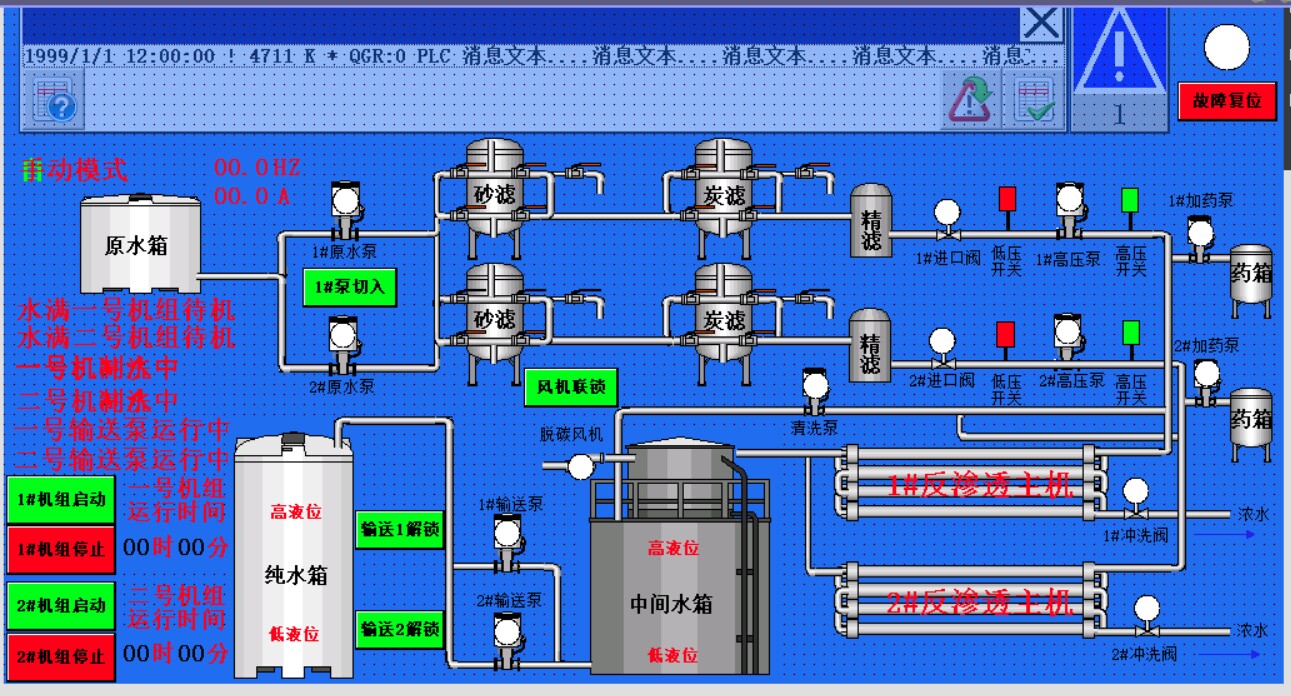 120吨双级反渗透程序+混床程序,以及阻垢剂、杀菌剂 加药。 一键制水,一键反洗,一键正洗,无人值守。 西门子S7-200 smart编程软件写的程序,程序+画面+电气原理图。 打包送出去,供初学者学习和研究。 程序有注释。