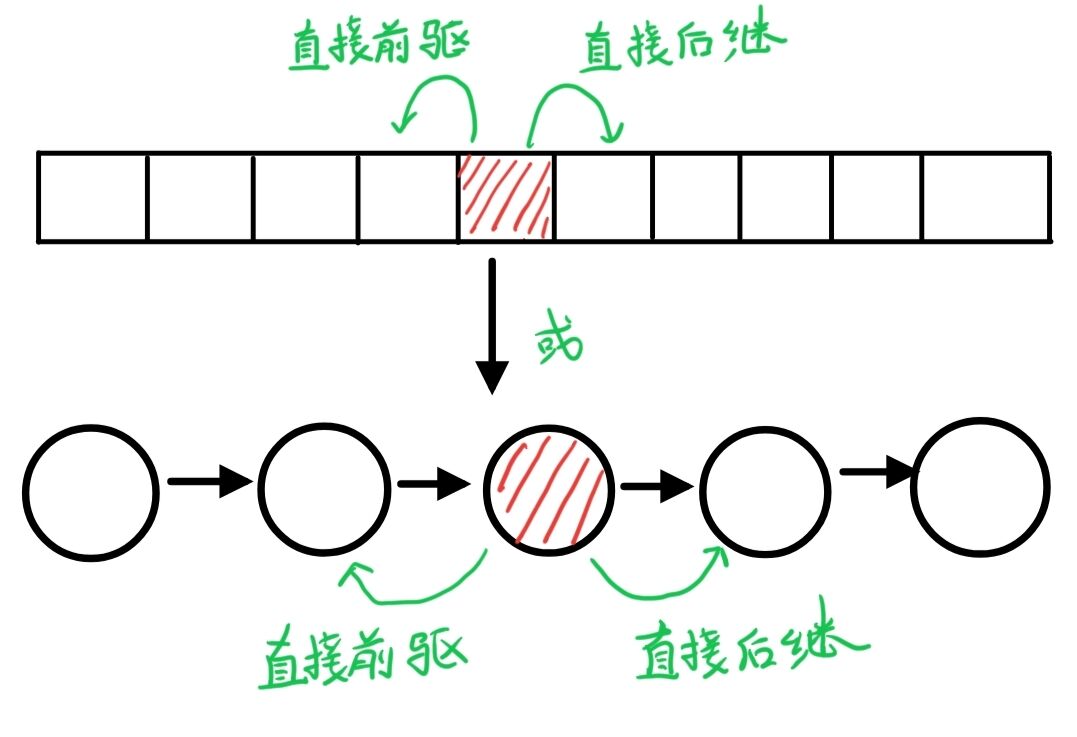 - 中间所有元素:恰好有一个直接前驱(前一个元素)和一个直接后继(后一个元素)
