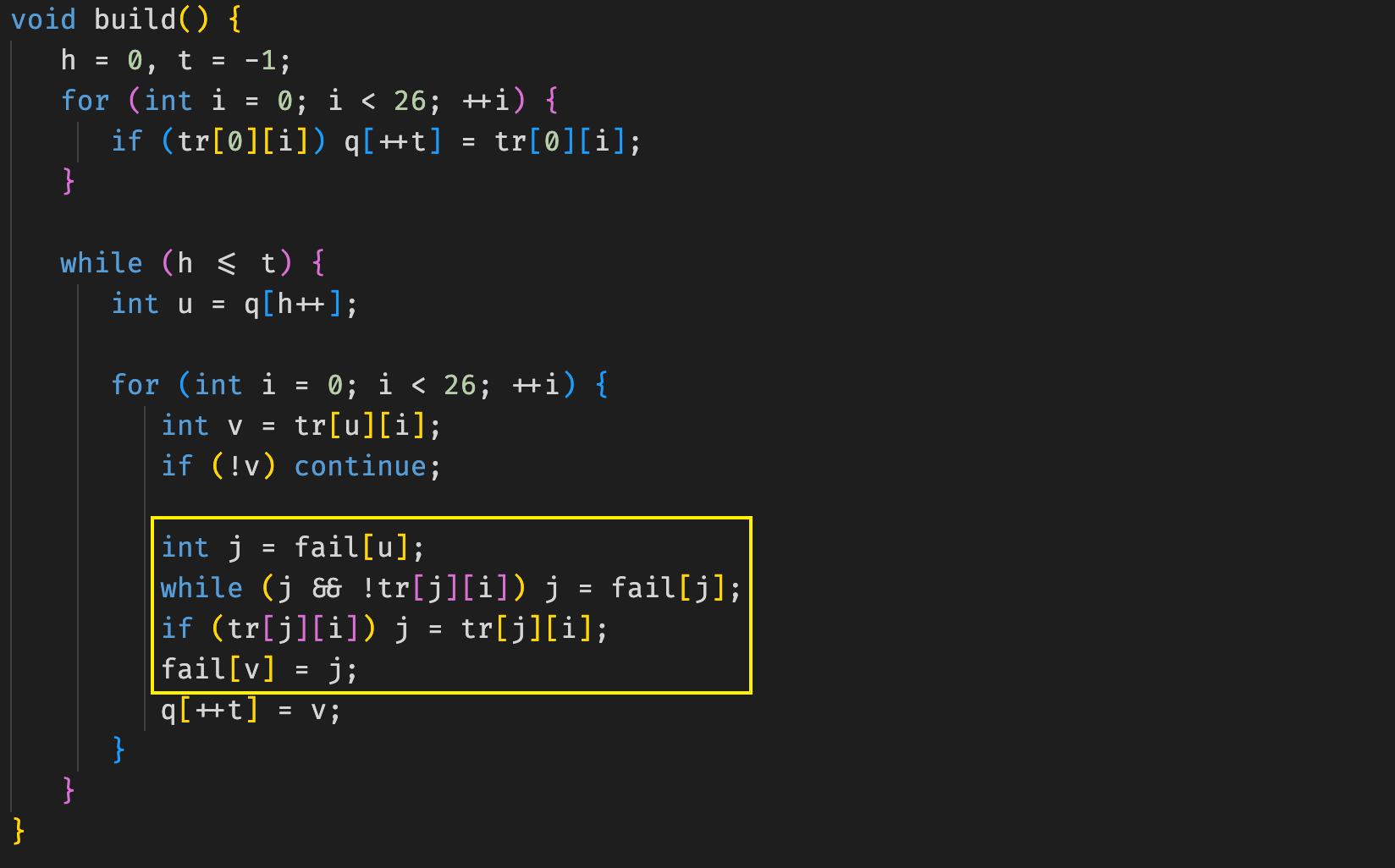 q是队列, h是队头, t是队尾, tr是Trie树, c是当前位置i, u是上一层位置i - 1, j = fail[u]