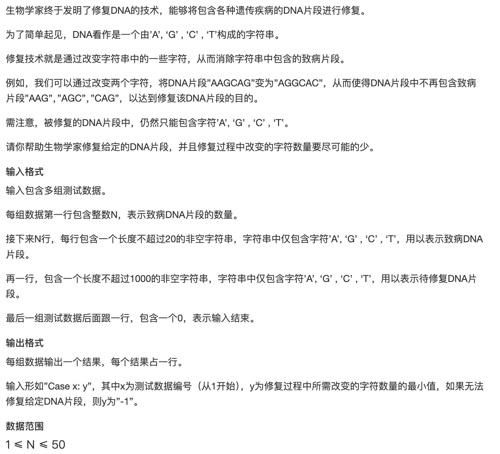 定义状态表示 f ( i , j ) f(i, j) f(i,j)表示考虑生成前 i i i个字符, 并且当前指向了AC自动机的第 j j j个位置 , 的所有方案中需要改变的字符数量最少的值