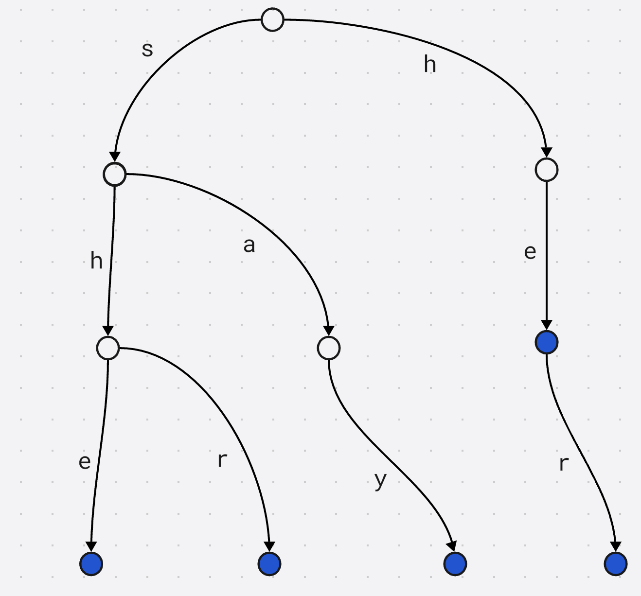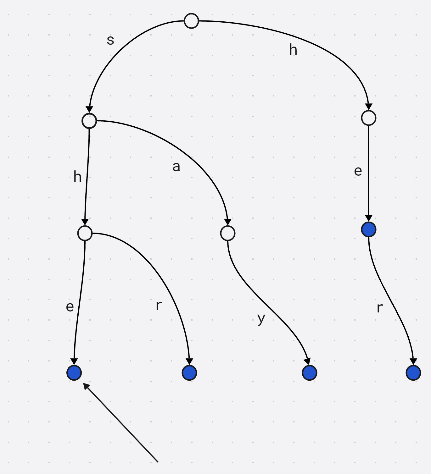 在上述Trie树中, she的最长匹配真前缀 在 h e he he的结尾