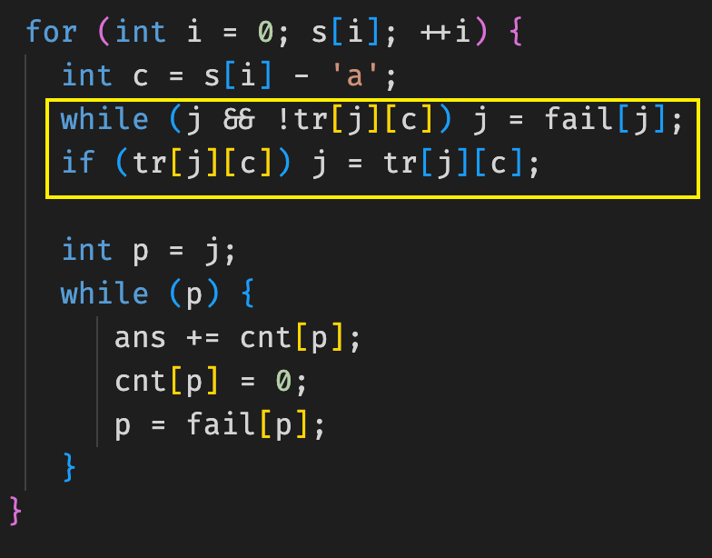 if (tr[j][i]), 那么j = tr[j][i], 类比到KMP算法if (s[j] == s[i]) j++或者if (s[j + 1] == s[i]) j++ - 然后记录当前