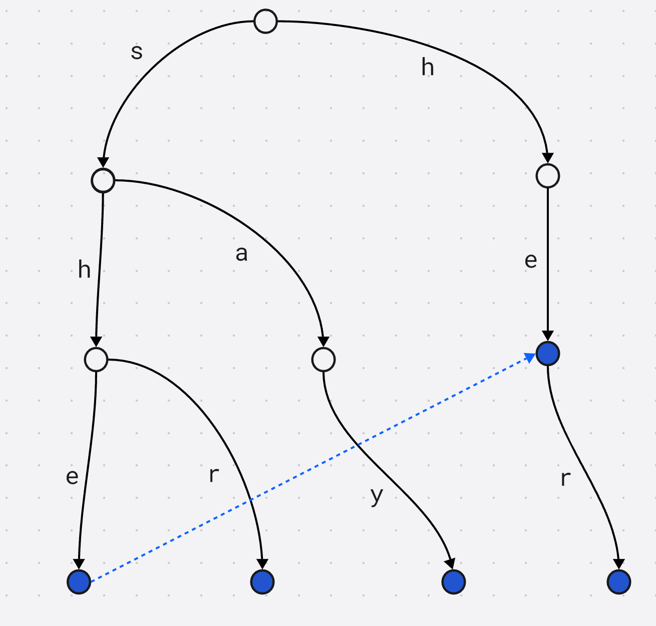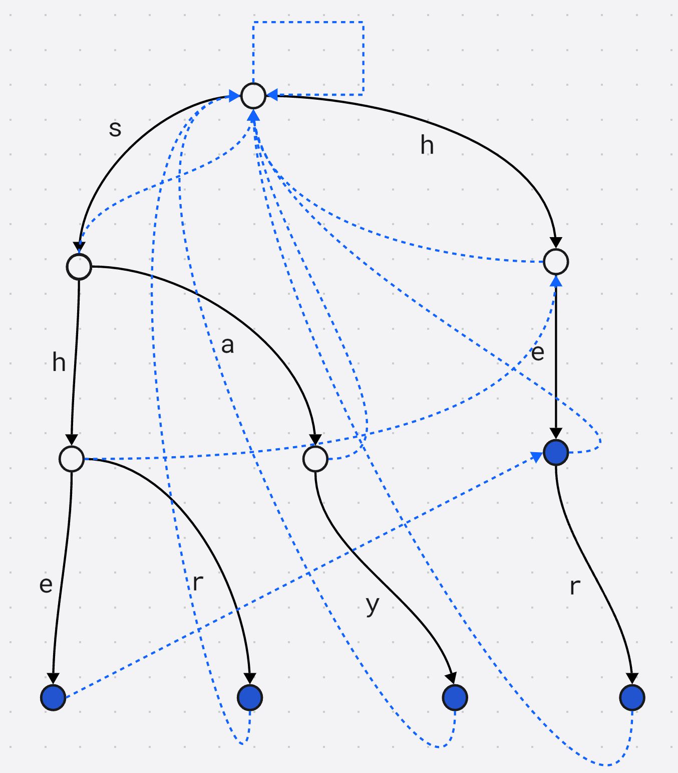 假设考虑当前子串she, 节点 e e e存储的是以 e e e结尾的某个后缀(后缀有e, he), 和某个最长真前缀 匹配的最长前缀的结尾下标