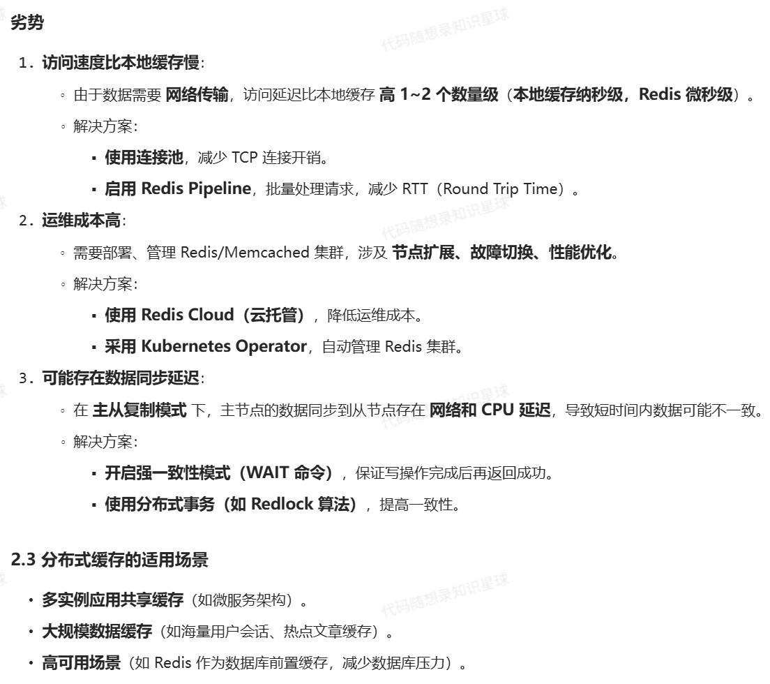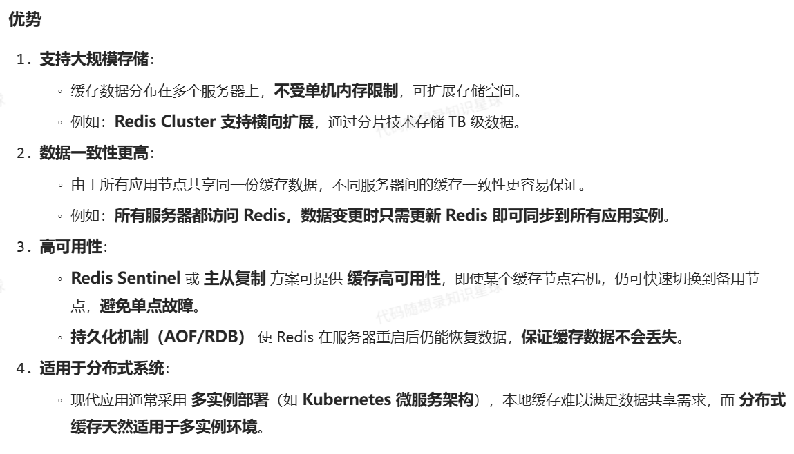 分布式缓存是一种 独立部署的缓存服务,与应用进程分离,多个应用实例共享同一份缓存数据,典型实现包括 Redis、Memcached、etcd。