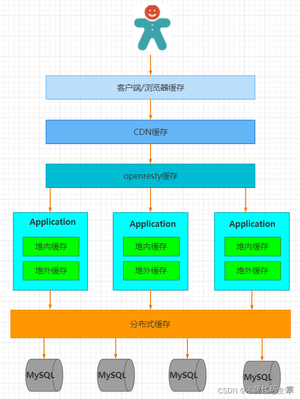 缓存的顺序:用户请求->HTTP缓存->CDN缓存->代理服务器缓存->进程内缓存->分布式缓存->数据库