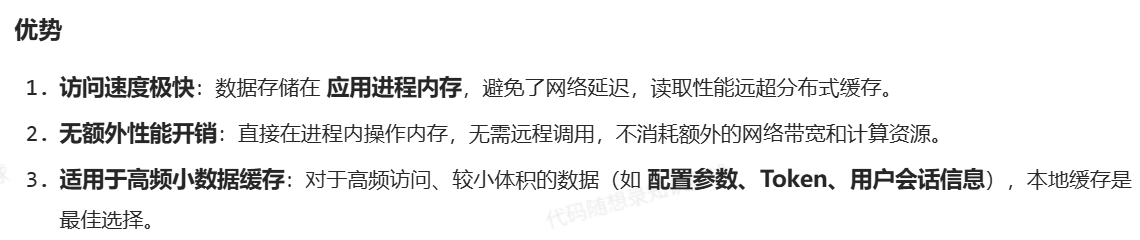 本地缓存是 直接存储在应用进程内存中的缓存,应用程序与缓存共存于同一进程,无需网络通信即可访问数据,访问速度极快。