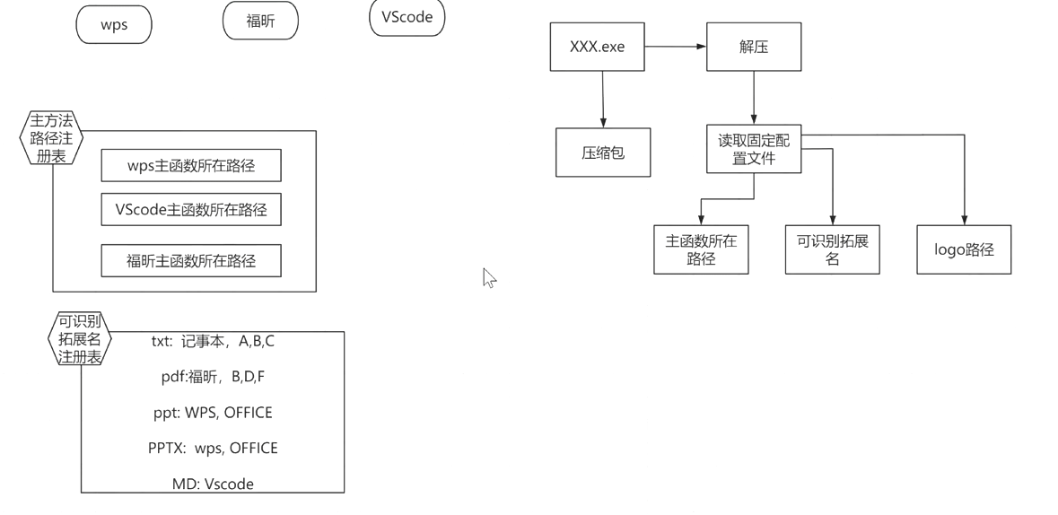 操作系统会记录主方法路径,当用户运行一个名为 XXX.exe 的可执行程序时,程序会先将自身解压(.exe实际上就是win系统可识别的一个压缩包),接着会读取一个固定的配置文件(win开发规定),从中获取关键信息,包括主函数所在的路径、支持的可识别文件拓展名以及 logo 路径等。
