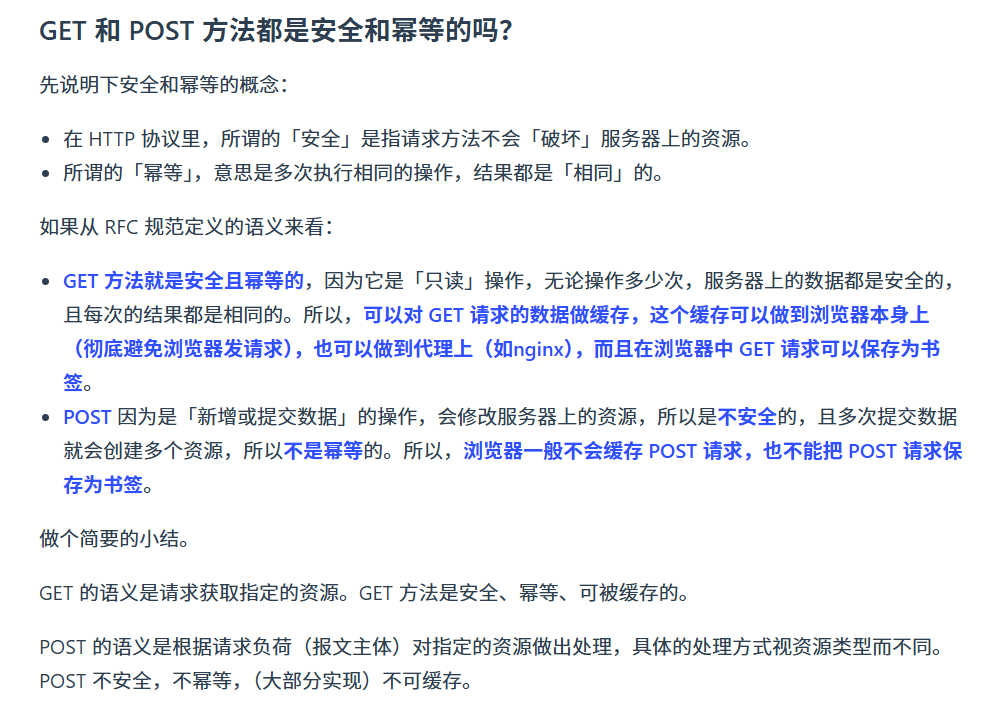 - 安全:请求不会 "修改 / 破坏" 服务器资源(只是读,不是写)。