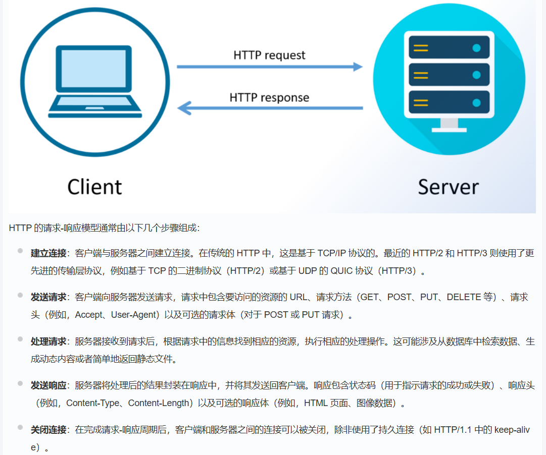 - 发送请求:客户端向服务器传递信息,包含 URL、请求方法(GET/POST 等)、请求头,POST/PUT 类请求还会带请求体。
