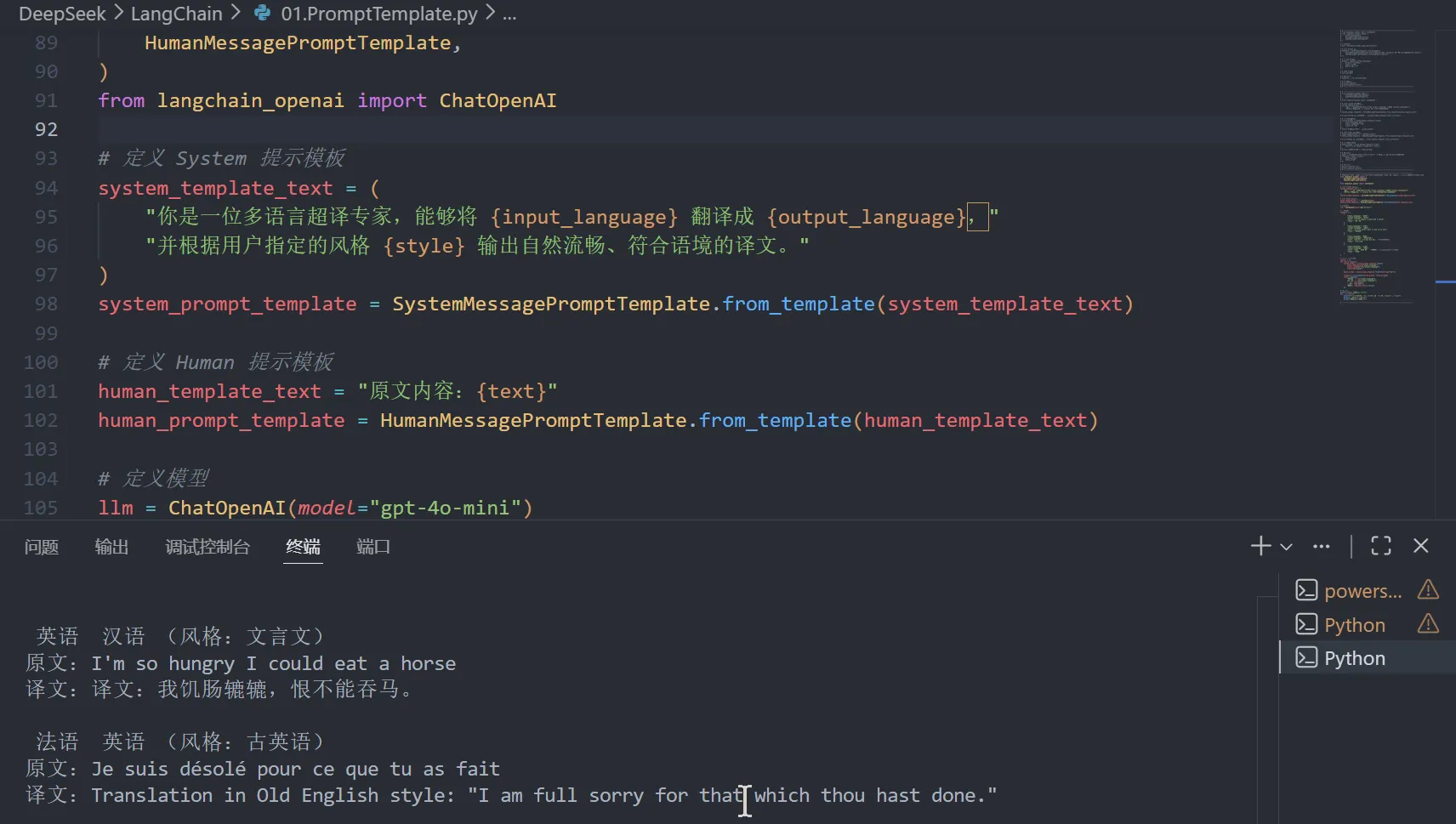 这段代码使用 LangChain 框架,构建了一个复杂的动态、多任务翻译工作流。它通过提示词模板(Prompt Templates)将 LLM 打造成一个"多语言翻译专家",能够根据每次请求的不同参数(输入语言、输出语言、翻译风格)动态地生成提示词,并循环执行多个定制化的翻译任务。