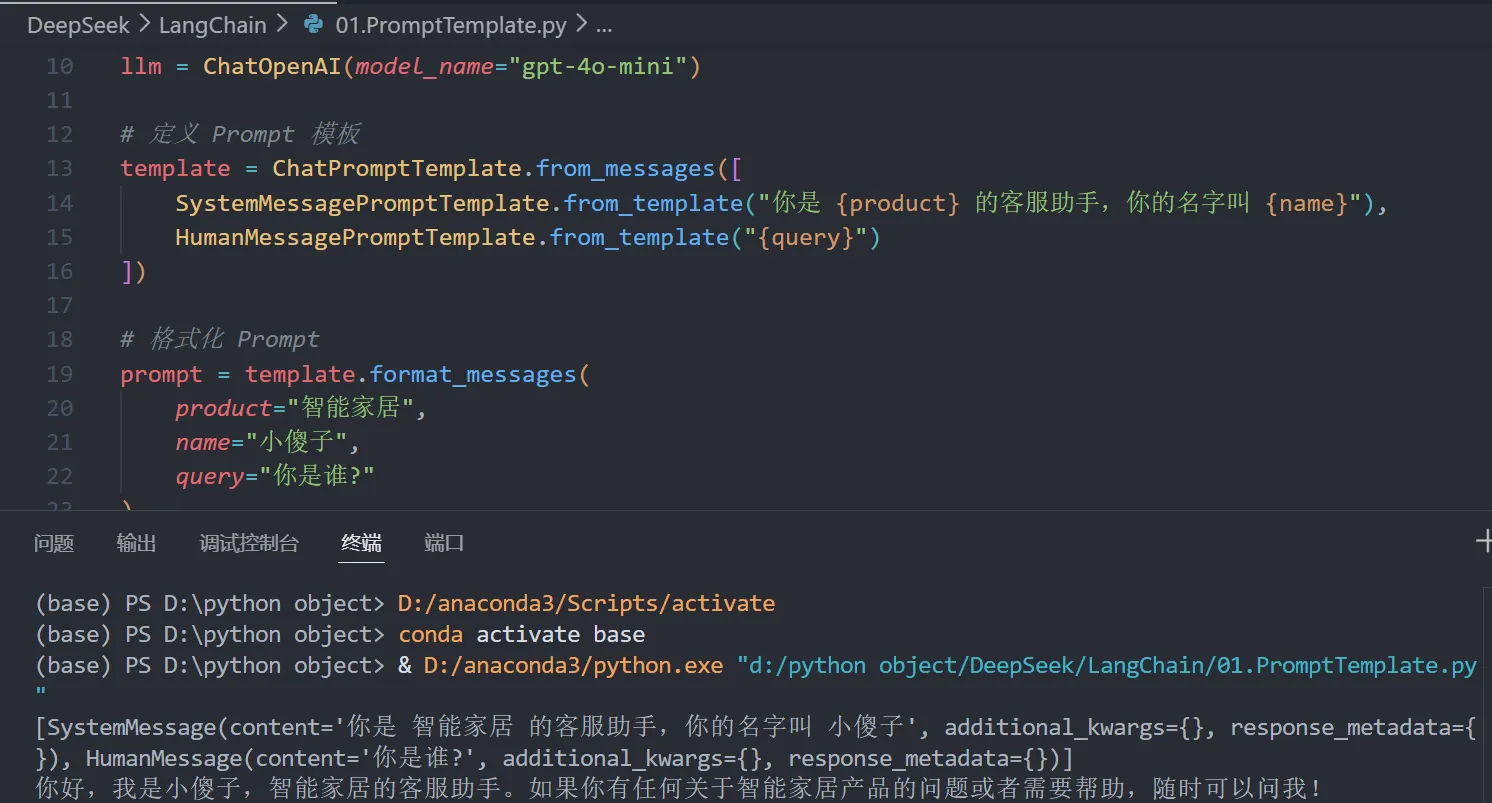 这段代码演示了如何使用 LangChain 框架构建一个基于 OpenAI 聊天模型 的客服助手,并清晰地展示了 ChatPromptTemplate 的工程化使用流程。