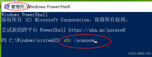 3、按 Win+X键 ,选择**"Windows** PowerShell ( 管理员 ) " 来以管理员身份 启动控制台,输入 "sfc /scannow" 修复系统文件,等着就行。
