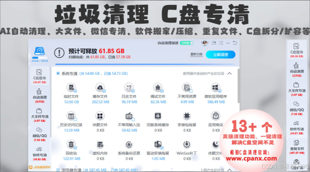 电脑系统和软件流畅运行是需要充足的磁盘空间的!若电脑存在大量的缓存垃圾文件,会导致系统软件运行异常。可以点击文章尾部的官网链接卡片 ,前往其官网并使用极智C盘清理软件的系统清理功能来清理缓存垃圾文件,保持系统干净清爽,远离系统蓝屏重启。