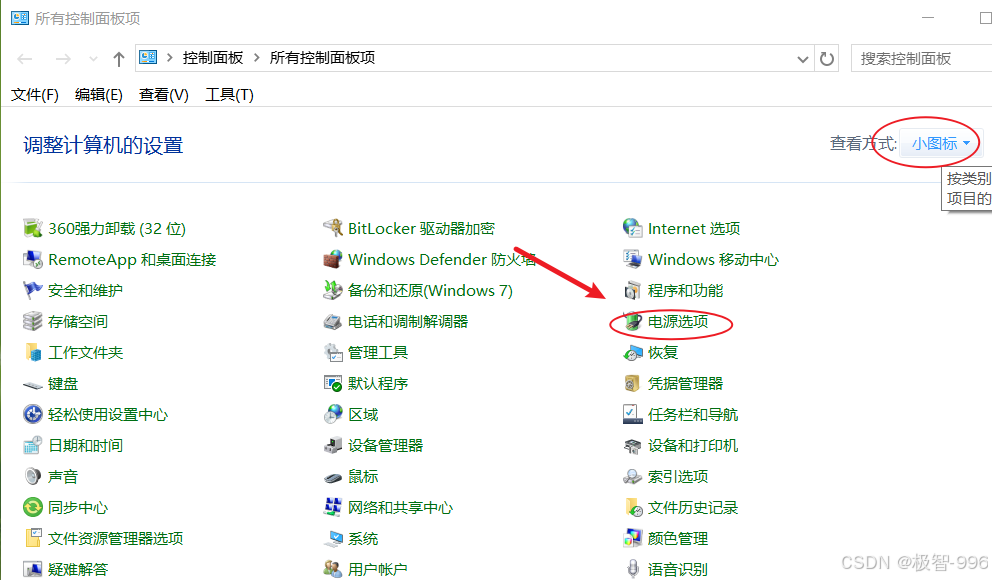 按 Win+R 输入 "control" 打开控制面板,改成 "小图标" 查看,点 "电源选项";