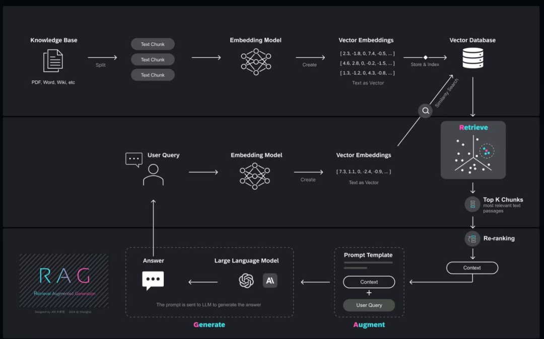 在这一部分主要流程就是读取pdf格式文件并转换为文档形式、将每个文档按照固定大小的chunk进行划分(有点类似于滑动窗口)、对每个chunk的文本生成嵌入向量及其对应的元数据、保存向量数据库。在构建向量数据库时可以做一些处理来增强后续检索的准确率,比如说在对所有文档进行chunk划分后,对于每一个chunk可以生成一段摘要和一系列使用者可能回根据这个chunk内容提出的问题,将这两部分内容分别存储在一个集合中,它们通过每个chunk的唯一标识id进行连接。还有就是可以调整chunk大小让其划分更加细致化即每段包含的内容更加精细,不过这样会增加计算和存储成本。在构建数据库时添加合适的元数据,可以使得模型推理的答案更加具有可解释性,比如回答完成后返回答案参考了那几篇文档的第几页,方便我们验证溯源。