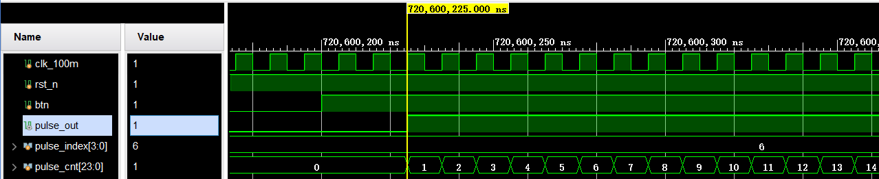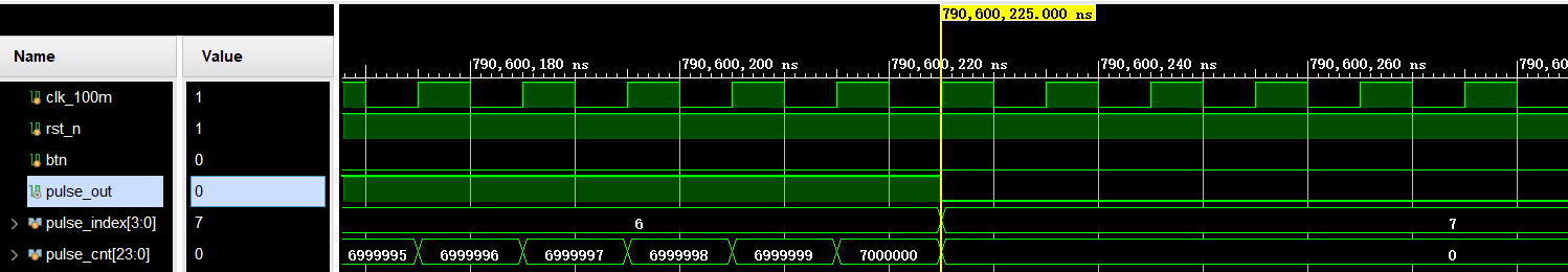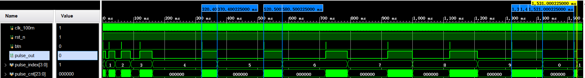 $monitor("Time=%t, btn=%b, pulse_out=%b, pulse_index=%d",