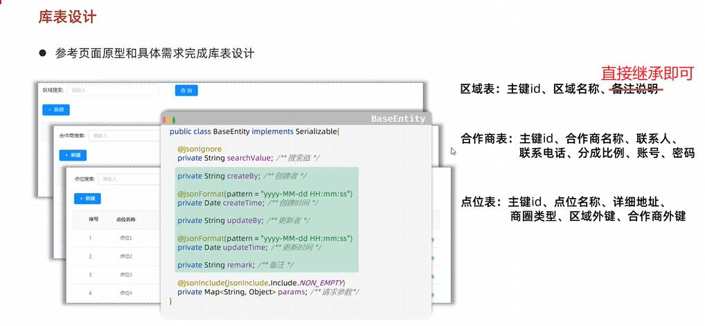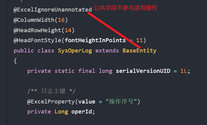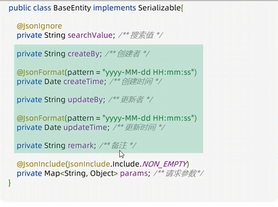 若依提供的基类BaseEntity,通过代码生成器生成的业务实体类会默认继承这个类,并且拥有这些公共属性