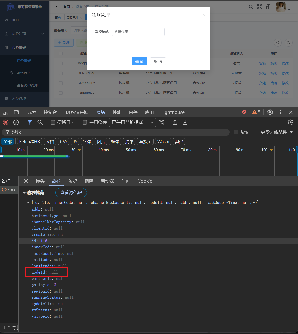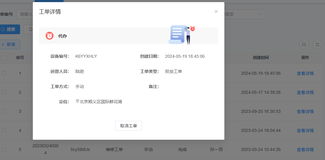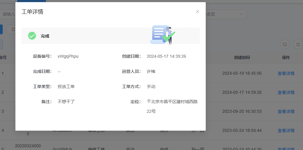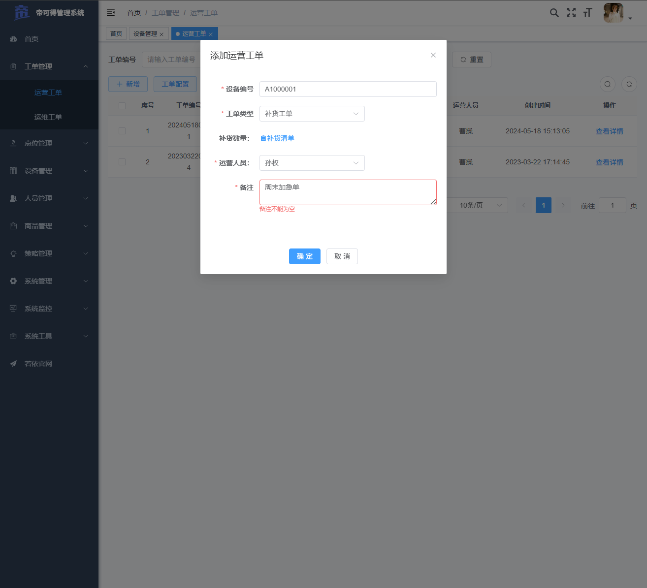 添加运维工单,如果是投放工单,要求设备不能在运行状态。如果是撤机 维修 补货工单要求设备必须在运行状态