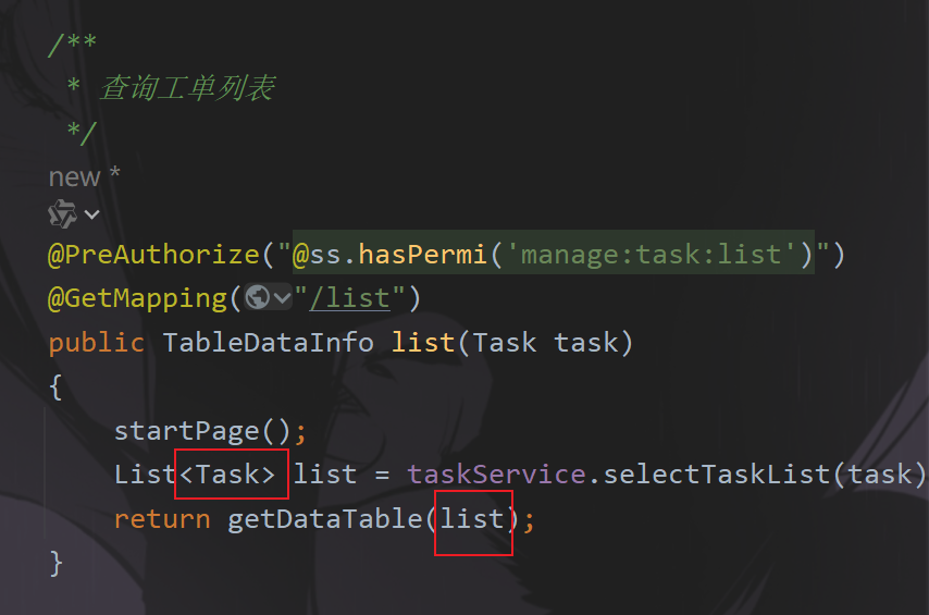@PreAuthorize("@ss.hasPermi('manage:taskDetails:list')")