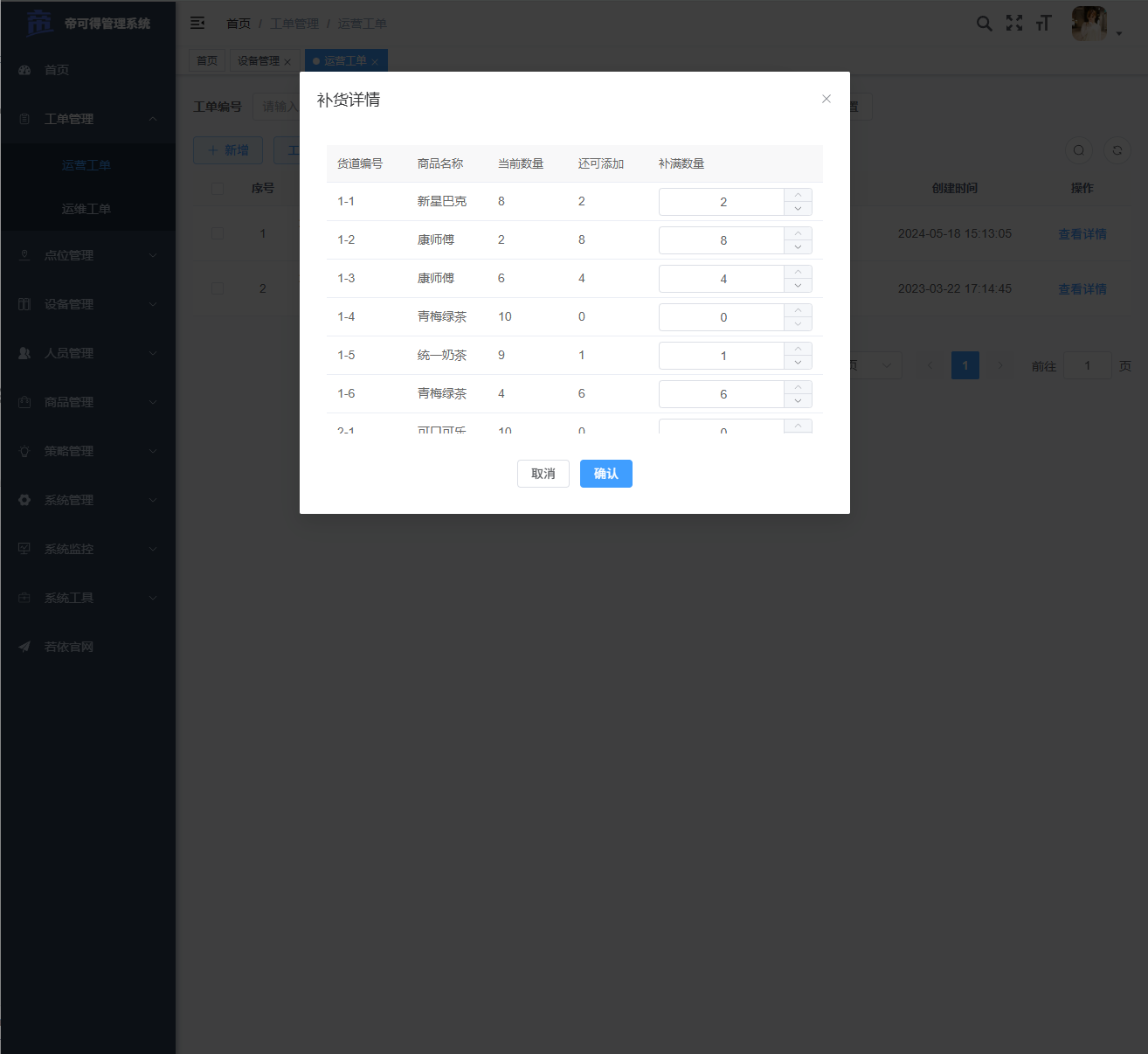 添加运营工单,如果是补货工单,还需要提供工单详情