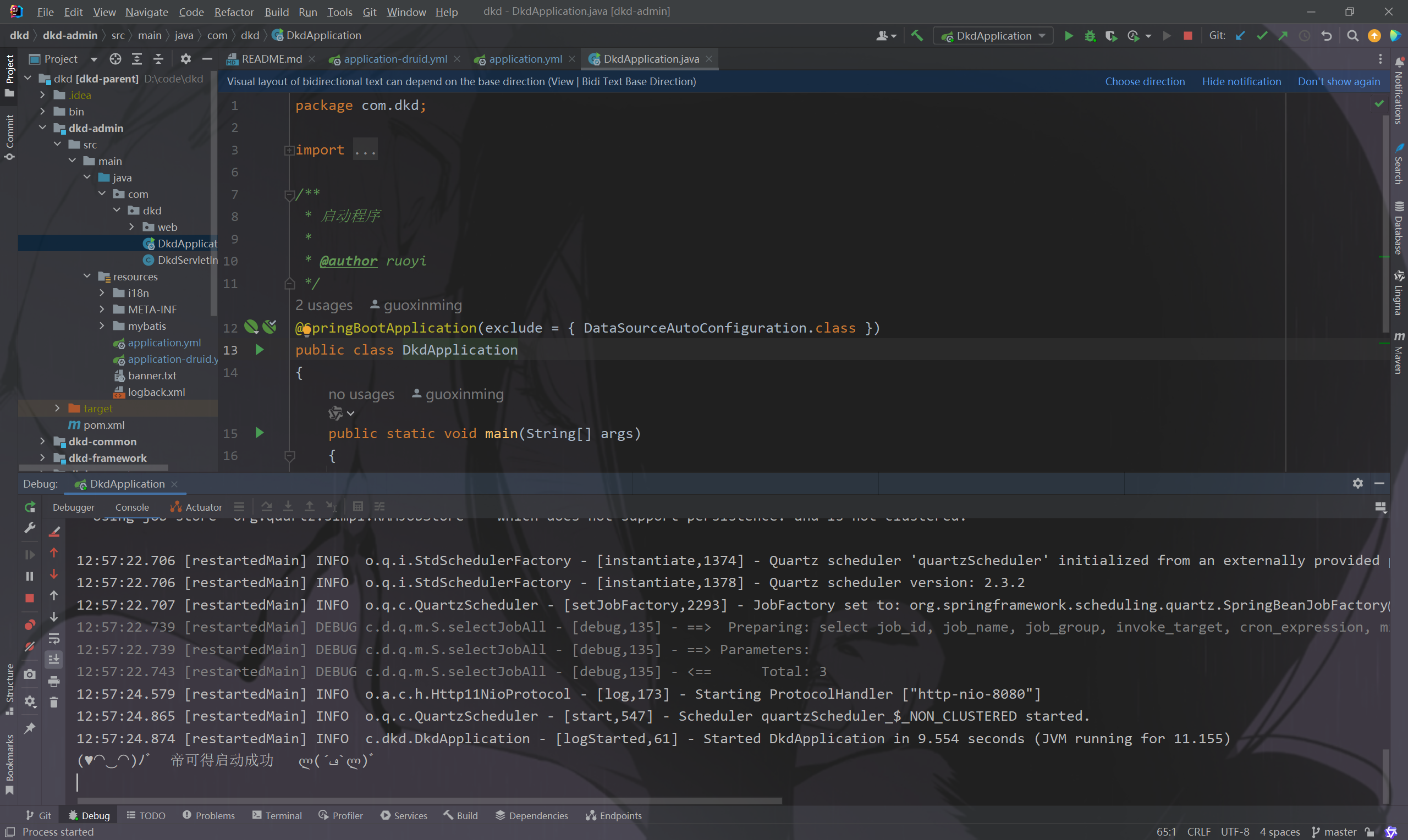更改配置文件数据库连接和redis配置,创建dkd数据库,导入sql脚本。运行DKDApplication启动项目