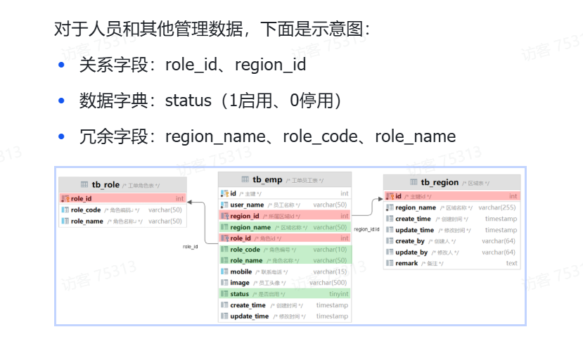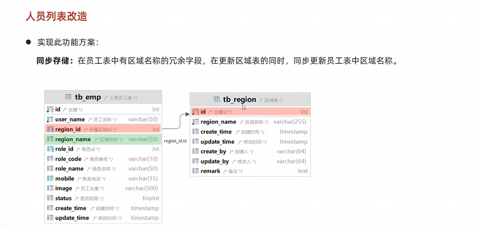 1,区域表,表名tb_region,字段有主键id、区域名称