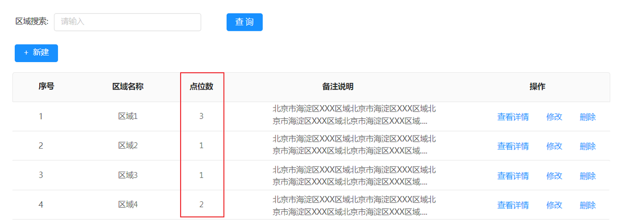 -- 查询区域表所有的信息,需要显示每个区域的点位数