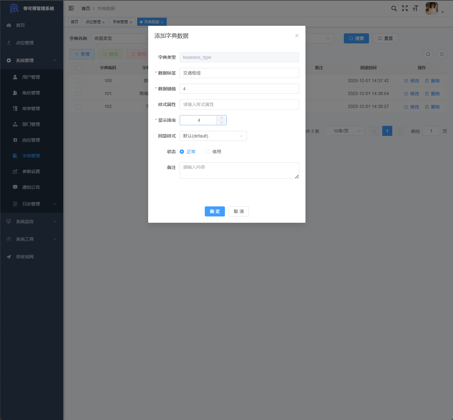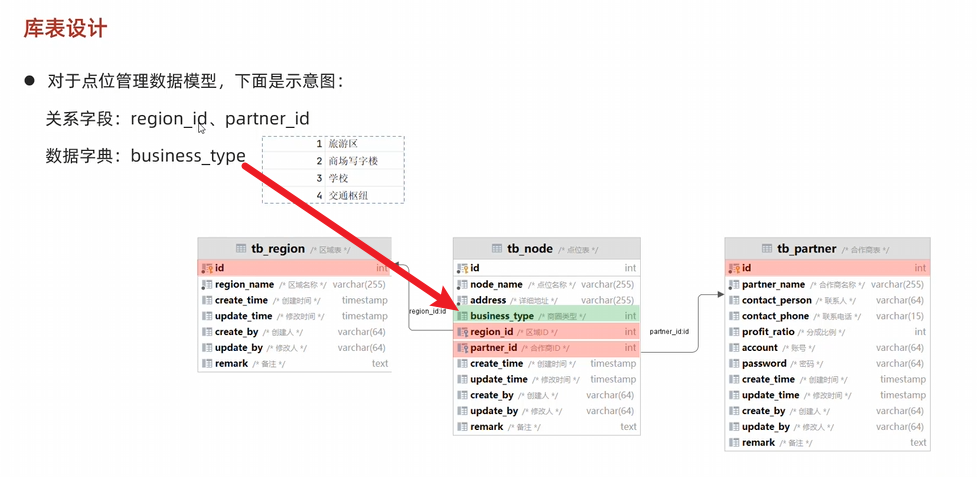 设置点位表:一个区域下可以添加多个点位,一对多,所以需要添加区域外键 ,商圈类型可以通过若依的数据字典进行设置,一个合作商对应多个点位,同样是一对多关系,添加合作商外键。