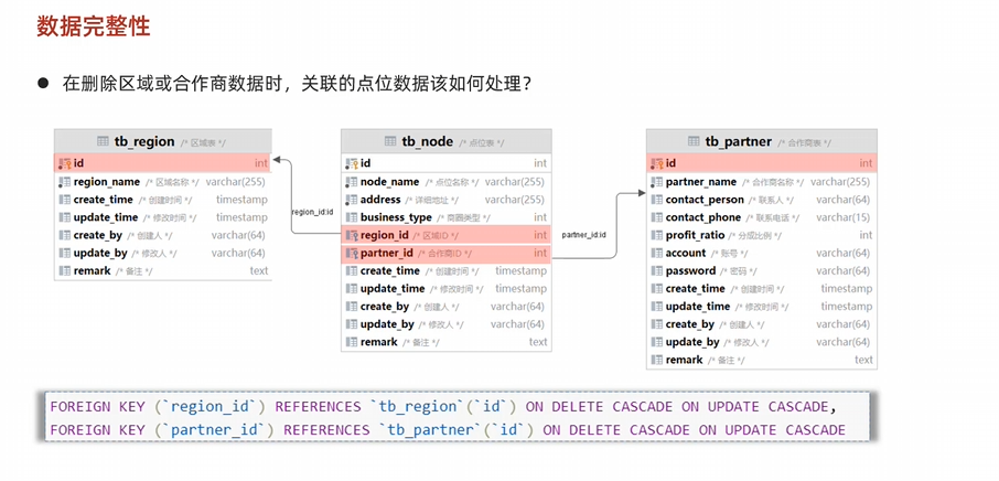 3,区域与点位是一对多的关系,合作商与点位是一对多的关系,请用字段表示出来,并建立外键约束
