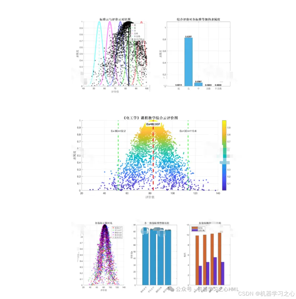 C_final与步骤三中设定的各标准评语云进行相似度计算(如计算云面积重合度、或基于Ex和En的距离度量)。相似度最高的标准评语等级即为最终评价结果。 - 可视化解读 :